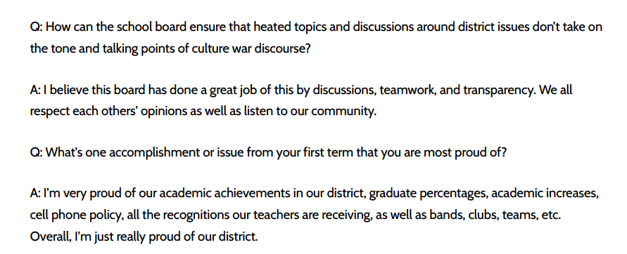 I believe transparency is a very good start. It’s one thing to be open and honest about what is happening in the district and another to do the additional work to involve and educate our community about various roles, committees, finances, and other parts of our school districts. Transparency should mean you’ll never have to guess why the board made a decision, you’ll hear it directly and clearly.